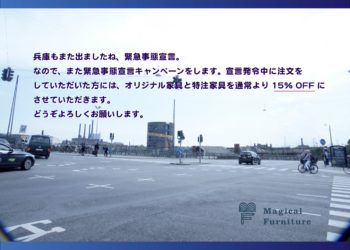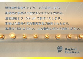 緊急事態宣言の延長にともない、マジカルファニチャーの緊急事態宣言キャンペーンも延長します。 家具のご注文を通常より15% off でお受けいたします。 期間は兵庫県が解除されるまで。 「急いでないよ」という気長に待ってい … 続きはこちら